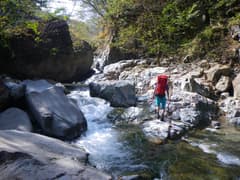 途中に一か所、深い淵があり、右から高巻く。程なくニゴリ沢出合に到着。パンを食べて昼食とする。前回の山行では、本流右岸を上がった台地にあるニゴリ小屋の傍でテントを張って泊まった。懐かしい場所だが、今日は立ち寄る時間的余裕がない。