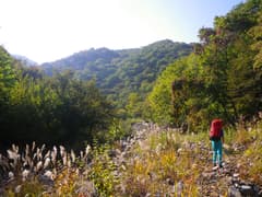 ニゴリ沢も河原が広い。途中でヤマブドウの実を見つけた。食べてみると良く熟していて、甘酸っぱくて美味しい。谷の奥に小滝を見る地点がモミジ尾根の取り付きで、赤と黄に塗り分けられた菱形の標識がある。
