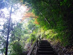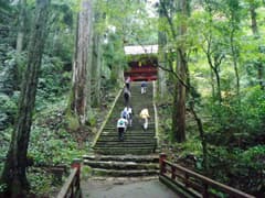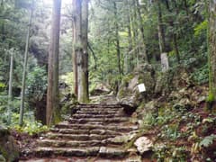 登山口から鳳来寺本堂までは、1425段の石段が延々と続く。長年踏まれた石段は丸く磨り減り、昨夜の雨で濡れて滑り易い。鬱蒼と茂る杉と檜の大木に囲まれて、霊山の雰囲気が漂う。5月には「仏法僧」の鳴き声で有名なコノハズクが飛来するそうだが、時期外れの今日は他の鳥の声もなくしんと静まり返って、沢音だけが聴こえる。