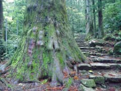 仁王門を潜ってさらに石段を登ると、ひと際太い杉の大木が現れる。傘杉と呼ばれ、幹周7.5m、樹高60m、樹齢800年、新日本名木百選の一つとのこと。見上げても高過ぎてカメラに収まらないので、太い根元を撮影する。