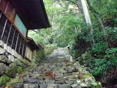まだまだ続く石段を登って行くと、参道の脇に僧坊の跡が多数あり、往時の信仰登山の賑わいを偲ばせる。現在は空き地に法華院趾、不動院趾などの名称を刻んだ石碑が建つ。堂宇が残る数少ない僧坊も無人のようだ。