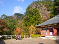 長い石段を登り切ると、鳳仙寺本堂に着く。本堂は背後に鏡岩と呼ばれる岩壁を巡らし、紅葉に縁取られた境内からは山麓の門前街が俯瞰できて、なかなかの景勝地だ。鳳来寺山パークウェイがすぐ近くまで通じているので(山頂駐車場から徒歩15分)、マイカーの観光客がぐっと増える。