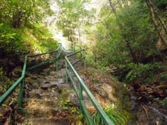 お堂の左手から東海自然歩道の道標に導かれて山道に入る。すぐに沢に沿って岩場を登る。ここの石段も滑り易く、手摺が頼りになる。