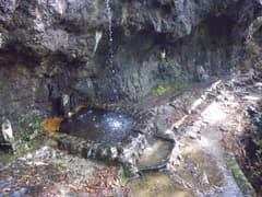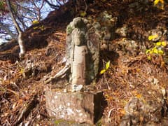 急斜面をジグザグに登る道の傍らには石仏がいくつも立ち並び、○○童子という銘が読める。岩壁の基部をトラバースすると水垢離場と赤白のお堂がある。勝岳不動といい、鳳来寺開山の祖・利修仙人の入寂の地と伝えられているそうな。