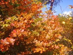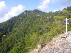 稜線を進むと「巫女石と高座石」という標識があるが、それらしい石はない。稜線の下の岩場を指しているようだ。この先は短い急坂を下り、鷹打場の分岐に着く。鷹打場も展望が良いとの話なので立ち寄ってみる。突き出た岩場となっていて、期待通り四方の展望が開ける。ここは休憩にもってこい。岩場に腰を降ろして、眺望を楽しみながらランチパックで昼食とする。