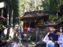 分岐に戻り、山腹をトラバースする。枝尾根を乗り越し、杉の大木の林を下って行くと、鳳来山東照宮に着く。徳川家康のご母堂が、子供のないことを嘆いて鳳来寺に参籠祈願したところ、竹千代(家康)を授かったとの所伝により、三代将軍家光が造営したとのこと。パークウェイの山頂駐車場から近いので、特に家族連れの参拝客が多い。お参りして、お守りをいくつか購入する。