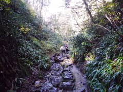 左に稲荷山コースへ繫がる山道を分け、小さな沢を詰める。昨夜の雨で道全体が沢のようになっているが、飛び石が置かれているので歩き易い。やがて沢を離れて尾根を登る。木の間から周囲の谷と尾根が眺められて、明るい雰囲気だ。それにしても今日は無風快晴のいい天気で良かった。