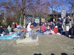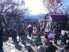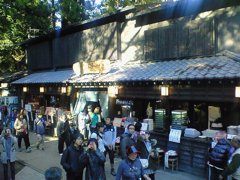 ベンチからちょっと登ると、人の列が続くメインストリートの1号路に合流し、ほどなく高尾山頂上に着いた。頂上はさらに人、人、人で大賑わい。広い山頂広場も、シートを敷いて昼食のハイカーさんで埋め尽くされている。頂上周辺には数軒の食事処がある。その内の一軒を覗いてみると、タイミング良く席が空いていたので、さくっと昼食にする。私は暖かいとろろそばを注文。麺がうどんの様に太いのが特徴で、なかなか美味しかった。