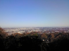 ケーブルカー山頂駅を過ぎ、1号路を麓まで歩いて下る。こちらはずっと舗装道なので下りには良いが、登るのはあまり面白くないだろう。尾根上を歩いて金比羅台まで行くと、澄みきった青空の下に都心方面の眺めが開け、紅葉した山麓や八王子市街、遠く都心の高層ビル群が望まれる。