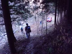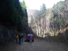 今日の行程は短いので、ゆっくり10時に桐生市街某所に集合。ハイトス号に5人がぎゅうぎゅう乗り込んで、忍山林道の奥に向かう。大茂(だいもん)の廃屋を過ぎた辺りからでこぼこの悪路となり、最低地上高が高い車でないと通行は難しい。しかし、ハイトスさんは快調に飛ばして、こういう道の運転が好きらしい(^^)。途中にゲートがあるが、幸いにも開いていて、林道終点まで入ることができた。