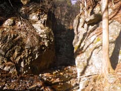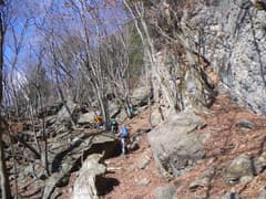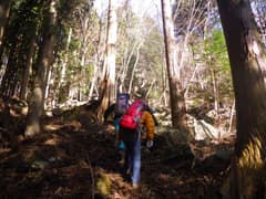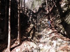 駐車場の奥から忍山川右岸の踏み跡を辿ると、すぐに朽ちた木橋で左岸に渡る。忍山川はこのすぐ先で残馬峡と呼ばれるゴルジュを成している。今日はそちらには行かず、左岸の割れ石が積み上がった斜面を登る。桐生みどりさんによると、昔は道があったそうだが、今は跡形もない。