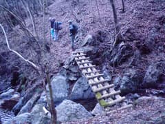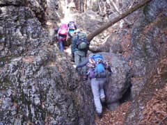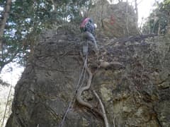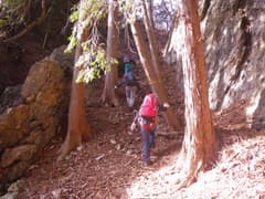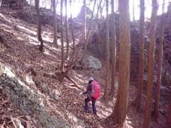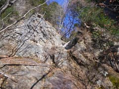 暗い杉林を抜けると明るい雑木林となり、浅い窪を登って行く。途中に小平地があり、何か遺構がありそうな所だが何もない。左前方の尾根に白く高い岩壁が現れる。この辺りで左に折れて、岩場の基部を登る。積み重なった大岩を登ると、高い岩壁に掛かる涸れ滝が現れる。一説によると紫雲の滝と呼ぶらしい。左からつるつるの岩壁をトラバースして落ち口に登るルートがあり、2基の梯子が掛かっている。これはスリル満点だ。