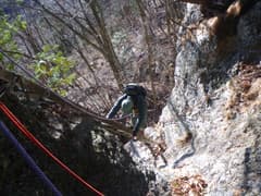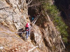 まず、桐生みどりさんが途中の鎖にビレイを取りながら落ち口まで登る。最後の梯子を支えているロープの強度がやばいらしい。次にハイトスさんが登り、Kさんは念のために私が持って来たハーネスを着け、カラビナをザイルに掛けて登る。げきさかさんは身軽に登り、私がラスト。全員が無事に登り切った。