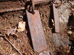 滝を登るルートには、錆びた太い鎖や古びたロープが張られ、その先に鉄梯子とアルミ梯子がある。鎖の銘板には「奉納大山祇?」、「願主下久方村領?」などの文字が刻まれている。いずれも老朽化しているので、念のためザイルを出して登ることになる。