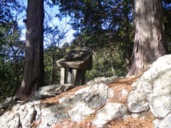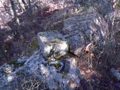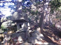 石祠の裏手には何かの台座が残っているが、上物は転げ落ちたのか、付近には見当たらない。その先は岩場になっていて、垂らしたザイルを摑んで下る。さらに尾根を登れば残馬山に至るが、かなり標高差があるので、今日はもう一つの石祠を訪ねてから下山することにする。