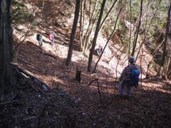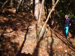 尾根から右の不動沢へ下る。落ち葉でふかふかの斜面を降り、左手の小さな尾根を登る。場所が判らなくてちょっとうろうろしたが、尾根の上に石祠を発見する。二本の檜の間に鎮座ましましていて、神さびた雰囲気のある場所だ。