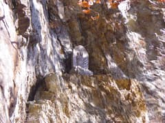 滝の右側の岩壁の途中の岩棚には不動様が祀られている。上から懸垂下降するにも、下から登るにも難しく、どうやって石像を運んだのやら。大変な労力だったと想像される。