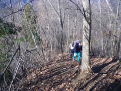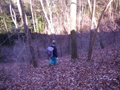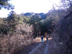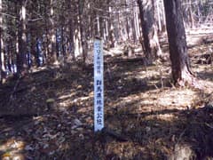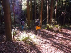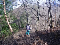 下山は稜線を東に下る。短い距離だが、急な痩せ尾根に枯れ葉が積もって滑り易い。鞍部に下り着くと、左折を指示するプレートが木に掛かっている。斜面を左(北側)に急降下して、すぐ下の平地に着く。樹林に覆われ、薄暗くて寒い。あとは急な個所はない。