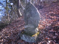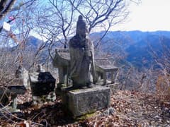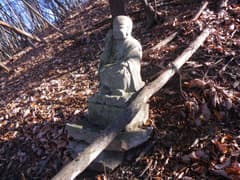冬枯れの雑木林の中は明るく、尾根上には踏み跡があって快適に登る。右から西尾根を合わせて登ると、急坂の途中に石像があった。頭襟(ときん)をかぶり、右手に錫杖を持ち、高下駄を履いた山伏姿で、誰かが脇の木につけたプレートには普寛像と記してある。