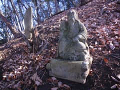 さらに登ると、今度は石像と石碑、倒れた石祠がある。石像は同じく山伏の装束だが、長い顎髭を蓄え、目を見開いた異形な仙人の像だ。台座には「神變大菩薩」と刻まれている。神変大菩薩(じんべんだいぼさつ)とは、役行者(役小角ともいう)の別名だそうだ。脇の石碑には「三寳大荒神」と刻まれていた。