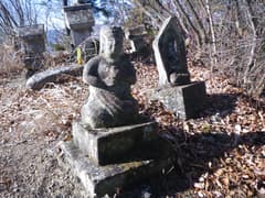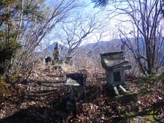 頂上は思ったより狭く、そこに石像と石祠6基が所狭しと祀られている。一番大きな像は御嶽山座王大権現で、台座には山二つ丸に三本線のマークが刻まれている。これは御嶽神社の神紋だそうだ。その他に石像が二体あるが、これは何だろう(2012-04-23追記:偏平足さんの記事「石仏376金剛萱(群馬)」によると金剛界大日如来だそうです)。