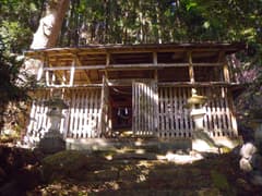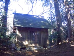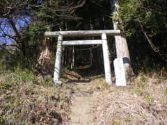 石段を降り、尾出山神社前のT字路を左に辿って塩沢峠に向かうと、すぐ先で車道の脇に鳥居と天照皇太神宮と刻まれた石柱が建っている。ここが裏山の神社への参道入口だ。鳥居と石柱は新しいが、鳥居の根元には「寛政…」と刻まれた石碑がある。鳥居を潜ると、急傾斜の石段が一直線に登っていて、大畑山の二百段を思い出す。こちらはしっかりした石段なので、登るのに不安はない。頂上には大きな杉の木に囲まれて社殿が建つ。尾出山の山岳修験道と関係があるかどうかは不明。
