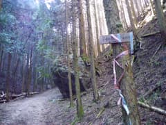 林道を辿り、次のY字路は右へ。小さな沢に沿って登ると暗い杉林に入り、また林道の分岐がある。「←不動岳 塩沢峠」という古い道標が左の道を指し示す。そちらには道端に大岩があり、目印になる。この先で太い流木が谷を塞ぎ、道型が不明瞭となる。気をつけて辺りを見回すと、右手の谷に細い踏み跡が続いているのを見つける。