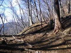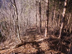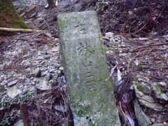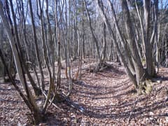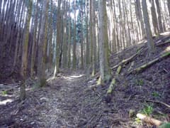 踏み跡を辿ると、道端に倒れかけて半ば埋もれた石柱があり、「右秋山ニ至る、左山道」と刻まれている。杉林の中の狭い谷を遡り、左に折れて山腹を登ると、明るい雑木林の枝尾根の上に出る。幅の広い道型があり、日溜まりの落ち葉をカサコソと踏んで登る。