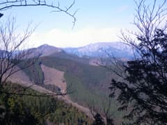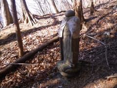 再び杉林に入り、山腹をジグザグに登ると塩沢峠に着いた。峠には首の代わりに丸石が載ったお地蔵さんが立つ。銘文は見当たらないが、年代は古そうだ。冬枯れの雑木林に覆われた峠は強風が吹き抜け、正午を回ってそろそろお腹が減っているのだが、寒くてのんびりできない。手早くお菓子だけ食べて、不動岳に向かう。