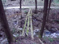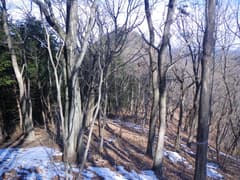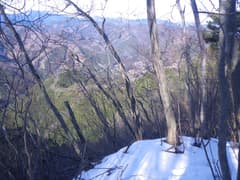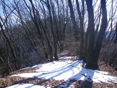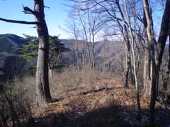 しばらく下ると傾斜も落ち着いて、はっきりした踏み跡を辿る。小ピークを越えてさらに下ると小平地に出る。樹林が切れて、塩沢峠付近の稜線が眺められる。ここから先はマーキングもなく、尾根の形、踏み跡共に不明瞭だ。日陰の斜面は凍っている可能性があるので避けて、左寄りの陽当たりの良い小尾根を下る。下部は暗い杉林の急斜面となるが、なんとか谷底まで降りて、朽ちた木橋に辿り着く。橋の脇に踏み跡があり、流れを渡って対岸の林道に出た。