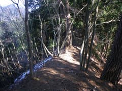 稜線上には明瞭な踏み跡が続き、藪はない。断続的にサラサラの積雪があるものの、スパッツが必要な程の深さではない。途中から黒木に覆われた痩せ尾根となる。左側の斜面はなかなか急峻だ。