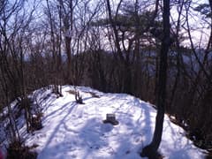 樹林に囲まれて展望には乏しく、僅かに木の間から金字形の尾出山とのっそりした山容の横根山が眺められるポイントがあるだけだ。急坂を登り詰めて、不動岳の頂上に着く。低い樹林に囲まれた頂上は狭く、三角点標石といくつかの山名標がある。雪に覆われて腰を下ろせる場所はないし、寒風吹きさらしで長居は出来そうにない。写真だけ撮って山頂を辞し、風を避けて少し下ったところで休むことにする。