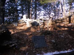 温まったところで、歩き始める。ピークを一つ越えると、稜線の左側は崖となって、山麓の集落を俯瞰する。低山ながら、なかなか高度感がある。僅かに登り返して、雷電山の頂上に着く。ここも展望はない。金属パイプの鳥居、屋根が崩れ落ちた石祠と「雷電山」の山名標がある。祠には「安永九庚子年九月吉日」の銘があり、結構古い(1780年)。
