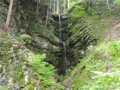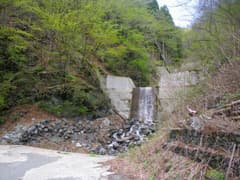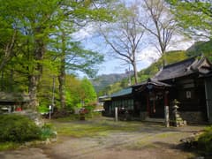 車道のすぐ脇に落ちる龍門の滝を見たのち、神流川公園に戻る。R462に出て万場の町並を西へ歩くと八幡神社がある。境内には推定樹齢600年の大ケヤキの御神木があり、芽吹いたばかりの鮮やかな新緑がきれいだ。これにて観光は終了。ここからが山歩きとなる。