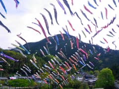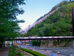 神流川の上にはたくさんの鯉のぼりが泳いでいる。折角なので観光していこう。神流川に架かる歩行者専用の「こいこい橋」で対岸に渡り、車道を歩いて鯉のぼりの下まで行く。爽やかな風に吹き流れる800旒(りゅう)の鯉のぼりはなかなか壮観だ。しかし、川面に目を落とすと、神流川は川幅いっぱいに近く増水していて、河原に残るテントやステージも流されかかった痕跡がある。犬の散歩中の地元のおじさんから伺った話によると、昨日の大雨で神流川が増水し、おじさんにも非常召集がかかって、河原で開催していたイベント用の施設・設備を小学校に移動するなど大変だったそうだ。