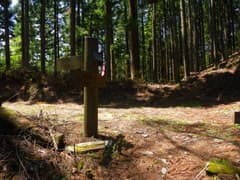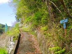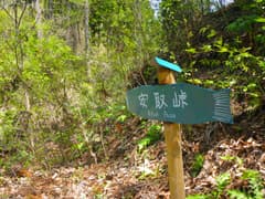 車道を右(北)に降りると栗木平、左(南)は船子川に通じる。古い道標を見ると、かつては尾根通しに山道があったようだが、今は藪に覆われて通れそうにない。「持倉・白髪山・御僧尾根→」という青プレートの道標にしたがって、未舗装の作業道に入る。ここから再びマウンテンランのコースに合流する。すぐに安取峠の道標があり、峠越えの旧道の切通しが残っている。かつての峠道も藪に覆われて廃道化し、全く通れそうにない。