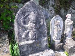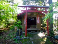 広い尾根の幅が急に狭くなると、高塩峠に着く。右(北)側にははっきりした峠道が下り、左(南)側はすぐ下まで作業道が通じている。左の木立の陰には苔むした1基の石祠がある。「昭和十八年十二月十七日」という銘が刻まれ、比較的新しい。今では峠を越える人はないだろうが、当時は往来が多かったのだろうか。
