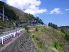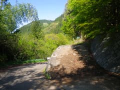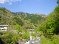 地形図には鈴波橋から船子川に沿って下る車道(林道桜井沢線)が記載されているが、全くの廃道となっている。集落の中央のT字路まで戻り、山腹をつづら折れで下る車道に入る。見上げる赤久縄山はなかなか急峻で高い。船子川に降り着き、あとは川に沿って車道を歩く。新緑に包まれた周囲の山々や、船子川の清流、ところどころに現れる山村の佇まいと、眺めはなかなか楽しめる。途中のオートキャンプ場には、BBQを楽しむグループが大勢来ていた。川には釣り師も多い。