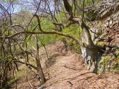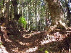 やがて作業道の終点に着き、山腹をトラバースする山道に入る。急斜面を横切るところもあり、張られたトラロープを握って通過する。滑落するとただでは済まない感じ。こんなところを走るのだから、マウンテンランはかなりハードだ。沢を横切る個所で水を掬って飲み、一息付く。
