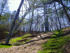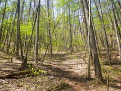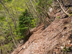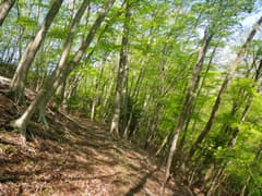 高塩峠からは、これまでの平らな尾根から一変して急登となる。左側は急斜面で、下の谷から流水の音が聞こえてくる。やがて新緑のカラマツ林に入り、右へ進路を変えて山腹をトラバースする。白石山の稜線は急な山腹のずっと上だ。神丸山とは隣同士なのに、山容が全く異なるのが面白い。
