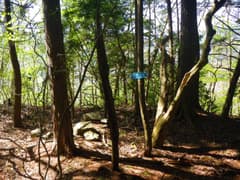 山道はなだらかな尾根の右側の緩斜面を水平に進む。ほとんど平坦でのんびり歩けるところだ。神丸山の山頂は巻いているので、頂上に近づいた適当な地点から疎らな雑木林の中を登って高みを目指すと、大した距離もなく神丸山の頂上に着く。頂上には三角点標石と鯉のぼり形の山名標がある。大会コースから外れたピークにも山名標があり、ちょっと嬉しい。樹林に囲まれて展望には乏しいが、南東方向に父不見山が見える。