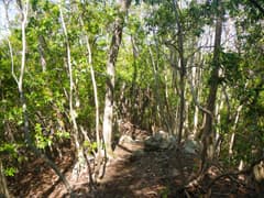 分岐点に戻って尾根道を辿ると、やがてトラロープが張られた急坂となり、曲輪(くるわ)の跡を経て千軒山の頂上に登り着く。樹林に囲まれて展望は全くなく、「千軒山(一夜城跡)」と書かれた道標があるだけだ。最後の急な登りで一汗かいたので、一休みして水を飲む。