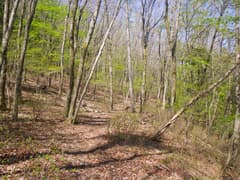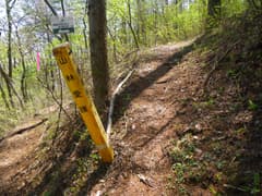神丸山頂上から尾根を辿ると、大会コースと合流する。合流点には神丸山への案内の道標があり、逆コースの場合は目印になる。この先も緩い尾根が続き、杉林を抜けると広く平坦な尾根となる。新緑の雑木林の中にはヤマツツジの赤い蕾がぽつぽつとほころび始めているのが見える。
