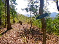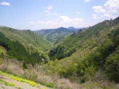 途中、「←一寸寄り道・一服 黒田展望地 2分」という道標を見掛けたので、立ち寄ってみる。分岐点からすぐで雑木林が切り開かれた場所に出て、南面の展望が開ける。眼下には新緑で覆われた神流川の谷が広がり、その向こうには上武国境稜線が青空にギザギザのスカイラインを描いている。これは展望地の名に相応しい佳い眺めだ。