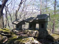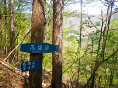 ようやく登り着いたピークには、新しいが潰れた石祠がある。ぽつぽつとミツバツツジが咲く稜線を緩く登ると、白石山の頂上に着く。頂上には石垣の上に3基の石祠が南を向いて祀られている。山名標は2種類ある。赤久縄山が木立を透かして見えるくらいで、展望はほとんどないが、雰囲気は明るく、落ち着ける山頂だ。腰を下ろして、しばし休憩する。吹き抜ける風が爽やかで、気持ち良い。