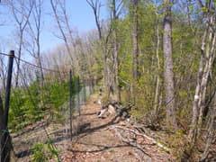 稜線の反対側の斜面には若い植林帯が広がり、鹿除けのネットが周囲に張り巡らされている。ネット越しになるが、上武国境稜線の眺めが良い。ネットに沿って稜線を登る。微かな踏み跡を辿るかなりの急登だ。大会コースを離れると、とたんに藪山っぽくなるな。