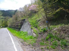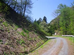 林道は山腹を巻きながら緩く下って行く。途中、湧き水で出来た道端の水たまりに夥しい量のカエルの卵があり、一部が孵ってオタマジャクシが群れて泳いでいた。オタマジャクシは可愛くて春爛漫という感じだが、卵の方は量が多過ぎて、ちょっと気味が悪い(^^;)