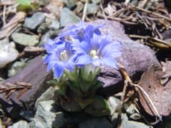 作業道は山腹の杉林の中を斜めに上がって行く。結構急な坂道だ。道端にはヤマブキが黄色い花をつけ、小さくて可愛いフデリンドウが咲いている。