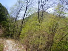 千軒山頂上の先は、小さな空堀を通り、アセビのトンネルを潜って進む。このあたりは坂道に付けられたステップが新しく、マウンテンランのために整備されたようだ。左から上がって来た未舗装の林道に合流し、暫く林道を辿るが、直ぐに終点となって山道に戻る。842m標高点のピークは右から巻く。新緑の木立を透かして、御荷鉾山系の主稜線が意外と近くに見える。巻道から尾根上に戻ると、南面の展望が得られる個所がある。再び上武国境稜線の山々が、黒田展望地からとは少し角度を変えて遠望できる。