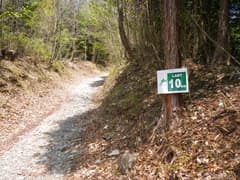 林道をなおも緩く下って行くと、マウンテンランのラスト10km地点の案内板がある。ということは、万場からここまで10km歩いて来たことになる。万場に戻ると20kmで、ほぼハーフマラソンの距離。復路も大変だ。